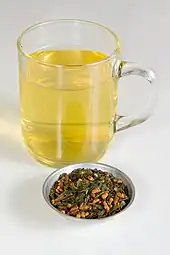 Genmaicha (玄米茶, "brown rice tea") is a Japanese brown rice green tea consisting of green tea mixed with roasted popped brown rice.[1] It is sometimes referred to colloquially as "popcorn tea" because a few grains of the rice pop during the roasting process and resemble popcorn, or as "people's tea", as the rice served as a filler and reduced the price of the tea, making it historically more available for poorer Japanese. Today all segments of society drink genmaicha.[2] It was also used by people fasting for religious purposes or who found themselves to be between meals for long periods of time.[2]