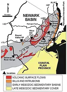 The Newark Basin is a region in northern New Jersey defined by the boundaries of a sediment-filled rift basin. This basin was formed when the supercontinent Pangaea began to split approximately 220 million years ago, causing several large depressions to form due to extension, which then filled with sediment. The basin itself extends from Rockland County in the southern tip of New York to south-eastern Pennsylvania. It lies within the broader region known as the Piedmont, a crescent-shaped area characterized by smooth topography and large volumes of sediments. Like the Piedmont, the Newark Basin has gentle topography consisting of red bed clastic sediments with occasional igneous rock formations, such as the Palisades Sill and the Watchung basalt flows; these igneous features are responsible for the dramatic elevation changes observed in the region, such as The Palisades and the Watchung Mountains, respectively. The boundaries of the Newark Basin, as well as major highways, are shown on the map at left......