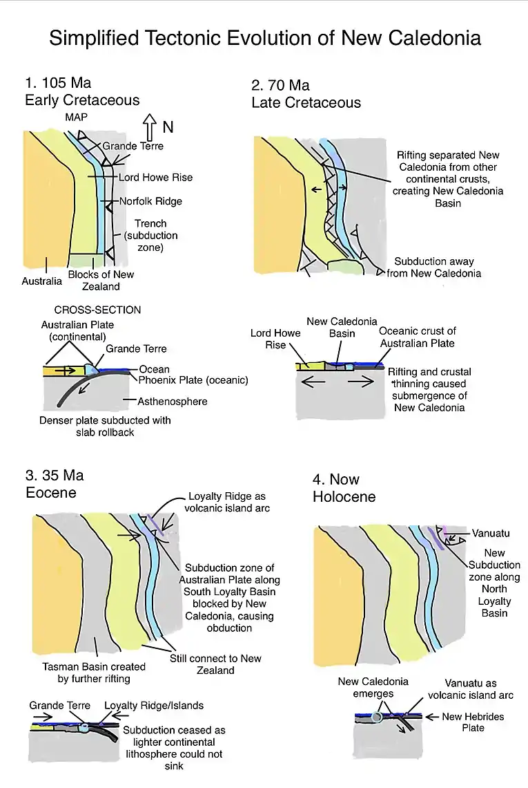 - 1 2 3 4 Sevin, B.; Maurizot, P.; Cluzel, D.; Tournadour, Elsa; Etienne, S.; Folcher, N.; Jeanpert, J.; Collot, Julien; Iseppi, M.; Meffre, S.; Patriat, Martin (June 2020). "Post-obduction evolution of New Caledonia" (PDF). Geological Society, London, Memoirs. 51 (1): 147–188. doi:10.1144/M51-2018-74. S2CID 219688924. Retrieved 2 October 2021.