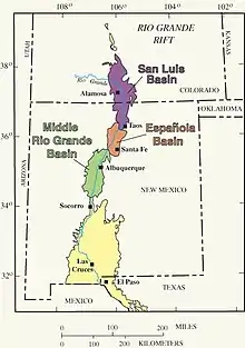 - ↑ Hawley, John; Kernodle, Mike (1999). "Overview of the Hydrogeology and Geohydrology of the Northern Rio Grande Basin - Colorado, New Mexico, and Texas" (PDF). WRRI Conference Proceedings. 44. Retrieved May 13, 2020.