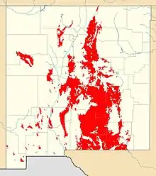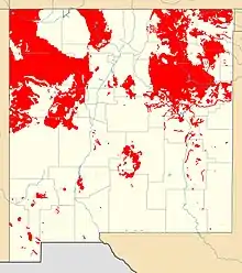 New Mexico is entirely landbound, with just 0.2% of the state covered with water,[1] and most of the state has an arid to semiarid climate.[2] Much of the state is mountainous, except for the easternmost Great Plains region.[3] The state thus has extensive bedrock exposures, which are assigned to four physiographic provinces.[4] These are the Great Plains, which makes up the eastern third of the state;[3] the southern Rocky Mountains in the north-central part of the state; the Colorado Plateau in the northwestern part of the state; and Basin and Range Provinces in the southwestern part of the state.[4] The presence of these four physiographic provinces gives the state great geological diversity.[5][6]