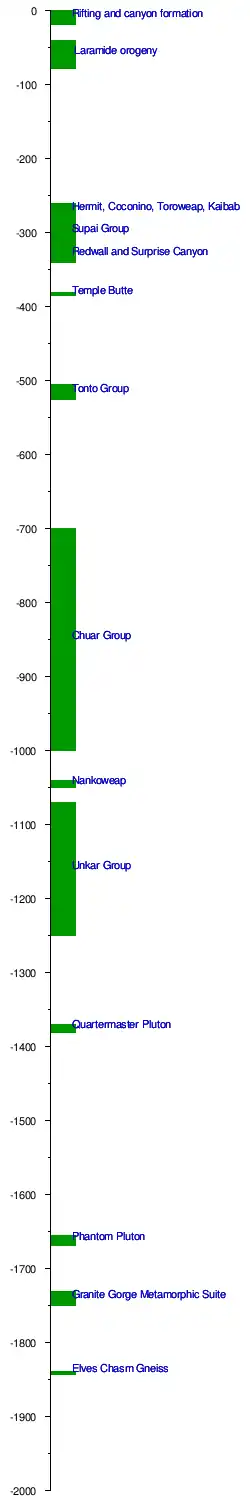 About 800 million years ago the supergroup was tilted 15° and block faulted in the Grand Canyon Orogeny.[21][22] Some of the block units moved down and others moved up while fault movement created north–south-trending fault-block mountain ranges.[9] About 100 million years of erosion took place that washed most of the Chuar Group away along with part of the Unkar Group (exposing the Shinumo Quartzite as previously explained). The mountain ranges were reduced to hills, and in some places, the whole 12,000 feet (3,700 m) of the supergroup were removed entirely, exposing the basement rocks below.[5] Any rocks that were deposited on top of the Grand Canyon Supergroup in the Precambrian were completely removed. This created a major unconformity that represents 460 million years of lost geologic history in the area.[23]