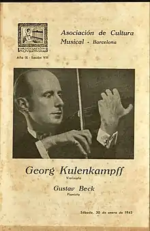 Kulenkampff's health was fragile from early life, and towards the end of the First World War he returned to his home town to become concertmaster of the Bremen Philharmonic. He made rapid progress, especially as a soloist, and in 1923 became professor-in-ordinary at the Berlin Music Hochschule. He taught there until 1926, when his solo career became all-absorbing, but resumed teaching there in 1931 until his departure from Germany in 1944. At the same time he gave concerts throughout Germany and, increasingly, in various parts of Europe, and had a busy broadcasting career. In 1927, he performed the Bach Double Violin Concerto in D minor with Alma Moodie (a student of Carl Flesch) and the Berlin Philharmonic (BPO)[1]