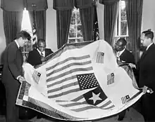 ![]() President John F. Kennedy meets with Vice President of Liberia William R. Tolbert. (L-R) President Kennedy, Vice President Tolbert, Liberian Ambassador George Padmore, and Deputy Director of the Office of West African Affairs Wendell B. Coote hold a quilted coverlet adorned with the Liberian and American flags. | |