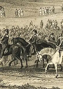 Joseph Jenner Merrett's panorama of the event on Saturday 11 May 1844, The New-Zealand Festival, looking across the Market Road / Great South Road intersection to Mount Saint John, depicts the arrival of Governor Robert FitzRoy in naval uniform, followed by a military officer, Attorney General William Swainson, Colonial Treasurer Alexander Shepherd and others on horseback, with Maori chiefs and Europeans in procession along "Market Road" from Remuera. Colonel William Hulme and officers of the 96th Foot went on foot.[1][11][47] "Each tribe occupied a separate portion of the ground, where temporary huts had been erected for their accommodation; and His Excellency visited each of them, shaking hands with the principal chiefs, and addressing them in short speeches, which were interpreted by the Chief Protector of Aborigines. After these proceedings were over, the natives performed a war dance in honor of His Excellency."[48] Having seen Maori war dances once or twice, Bennett found it entertaining rather than frightful.[11]
