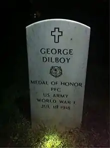 George Dilboy (Americanized transliteration of Greek name, Georgios Dilvois: Γεώργιος Διλβόης), (February 5, 1896 – July 18, 1918), Private First Class, U.S. Army, Company H, 103rd Infantry Regiment (United States), 26th Division is thought to be the first Greek-American to receive the Medal of Honor during World War I. He led an attack on a machine gun position and continued to fire at the enemy despite being seriously wounded, killing two of the enemy and dispersing the remainder of the gun crew. General John J. Pershing, commander of all the American forces in France during the war, listed George Dilboy as "one of the ten great heroes" who "died in the battlefield of France with super-human heroism and valor."[1] Dilboy is buried in Section 18 of Arlington National Cemetery.