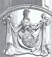 Arms of Fane quartering Neville, Barons Bergavenny (Gules, a saltire argent charged with a rose of the field[2]), relating to parentage of George Fane of Burston, younger son of Sir Thomas Fane and Hon. Mary Neville. A crescent is shown as the difference for a second son. Engraving of the tomb of himself and his wife Elizabeth Spencer (d. 1618) in Westminster Abbey