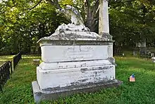 President Andrew Johnson offered Thomas the rank of lieutenant general—with the intent to eventually replace Grant, a Republican and future president, with Thomas as general in chief—but the ever-loyal Thomas asked the Senate to withdraw his name for that nomination because he did not want to be party to politics. In 1869 he requested assignment to command the Military Division of the Pacific with headquarters at the Presidio of San Francisco. He died there of a stroke on March 28, 1870, while writing an answer to an article criticizing his military career by his wartime rival John Schofield.[35] Sherman, by then general-in-chief, personally conveyed the news to President Grant at the White House. None of Thomas's blood relatives attended his funeral as they had never forgiven him for his loyalty to the Union. He was buried in Oakwood Cemetery, in Troy, New York. His gravestone was sculpted by Robert E. Launitz and comprises a white marble sarcophagus topped by a bald eagle.[40]