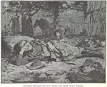 In Mexico, Thomas led a gun crew with distinction at the battles of Fort Brown, Resaca de la Palma, Monterrey, and Buena Vista, receiving two more brevet promotions.[14] At Buena Vista, Gen. Zachary Taylor reported that "the services of the light artillery, always conspicuous, were more than unusually distinguished" during the battle. Brig. Gen. John E. Wool wrote about Thomas and another officer that "without our artillery we would not have maintained our position a single hour." Thomas's battery commander wrote that Thomas's "coolness and firmness contributed not a little to the success of the day. Lieutenant Thomas more than sustained the reputation he has long enjoyed in his regiment as an accurate and scientific artillerist."[15] During the war, Thomas served closely with an artillery officer who would be a principal antagonist in the Civil War—Captain Braxton Bragg.[16]