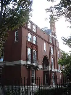 The Howards lived in London in Kensington, in a house at 1 Palace Green,[7] built for them by Arts and Crafts architect Philip Webb in 1870,[8] and at Naworth Castle. Among their visitors at Naworth were Robert Browning, William Ewart Gladstone, Lewis Carroll, Alfred, Lord Tennyson and many others.[9] William Morris was an intimate friend, and his wallpapers were used in Kensington, at Naworth Castle and at Castle Howard when George inherited it.[10] With Morris and Webb he was one of the founding members of the Society for the Protection of Ancient Buildings.[11]