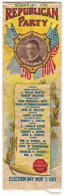 Never before having sought political office for himself, Mr. Earle was eventually sought after and subsequently backed by U. S. Senator Boies Penrose to be the Republican candidate in the election for mayor of Philadelphia in 1911. In the Republican primary election held on 30 September 1911, Earle defeated William S. Vare by 23,000 votes; but Earle would lose the general election in November of that year by 4,000 votes to the Keystone-Democrat fusion candidate, Rudolph Blankenburg—an independent Republican and also former member of Philadelphia's Committee of One Hundred.[13]