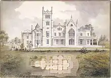 In 1864 Merritt bought Knoll, the former country estate of William S. Paulding, Jr. and hired architect Alexander Jackson Davis to expand the estate, doubling the house's size in the gothic revival style between 1864 and 1865, renaming it "Lyndenhurst" for the estate's linden trees.[13] His new north wing added an imposing four-story tower, new porte-cochere (the old one was reworked as a glass walled vestibule) and a new dining room, two bedrooms, and servants quarters. After his death, his widow, Julia sold the Irvington house to financier Jay Gould.[14]