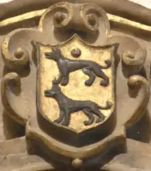 1. As shown on a 17th century monument of a member of the Peard family in St Peter's Church, Barnstaple. Blazon: Or, two wolves passant in pale sable langued gules,[1] here shown with A crescent sable for difference.