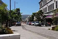 George Street is the main street of Dunedin, the second largest city in the South Island of New Zealand. It runs for two and a half kilometres north-northeast from The Octagon in the city centre to the foot of Pine Hill. It is straight and undulates gently as it skirts the edge of the hills to its northwest. South of The Octagon, Princes Street continues the line of George Street south-southwest for two kilometres.