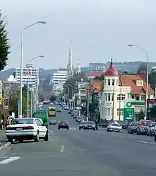 Numerous other buildings on George Street also have Historic Places Trust protection, notably Knox Church (Category I),[13] Other buildings with Category I or II protection include commercial buildings at 207,[14] 310,[15] 398,[16] and 412a George Street;[17] a hotel at 619 George Street;[18] and residential properties at 504 (now used commercially),[19] 521,[20] 603[21] 607,[22] 613[23] 657[24] 1008,[25] and 1014 George Street,[26] as well as semi-detached houses at 637[27] and 641 George Street[28] and a terraced block, 1046–1056 George Street.[29] The former Bank of New Zealand building (now a real estate agent's premises), adjoining George Street close to Knox Church on the corner of London and Pitt Street, is also a Category II building.[30]