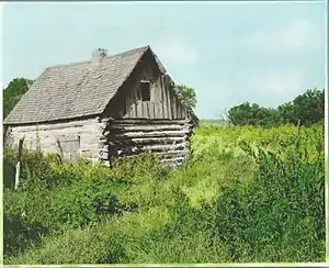 Inkster's 1878 log cabin in the vicinity of what would become Inkster, North Dakota. Photograph taken in the 1910s.