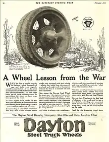 Success of Dayton Steel Truck Wheel in World War I prompted Dayton Steel Foundry advertisement in Saturday Evening Post.