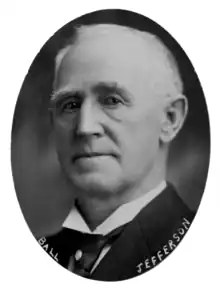 George W. Ball was born in Hancock County, Virginia (now West Virginia), the son of Joseph and Margaret (Longfitt) Ball.[2] He was descended from the family of which belonged Mary Ball, the mother of George Washington. He came with his parents to Jefferson County, Iowa, in 1854 where he attended the public schools and Fairfield University. He engaged in farming, banking and manufacturing, was a director in the Iowa State Savings Bank, the Iowa Loan and Trust Company and the Fairfield Gasoline Engine Company, all of Fairfield. In 1887 he was elected representative and re-elected two years later. Again elected in 1914, he served as representative in the Twenty-second, Twenty-third and Thirty-sixth General Assemblies. In 1916 he was elected senator from the Jefferson-Van Buren district, and served in the Thirty-seventh and Thirty-eighth General Assemblies.[1] He vigorously proposed repealing the law for extending and improving the capitol grounds.[3]