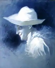 Georges Wague taught pantomime, notably to the writer Colette, with whom he made a tour from 1906 to 1912 and caused a scandal with presentations of La Chair (Flesh) where Colette was largely naked.[4] Wague performed in many stage pantomimes including Scaramouche, Barbe Bluette and L'homme aux poupées, and played silent roles in ballet and opera. Between 1907 and 1922, he also performed in more than forty films.[5] He started his film career with the silent film L'Enfant prodigue (The Prodigal Son) by Michel Carré, where he played a Pierrot. His last film performance was in 1922 in Faust by Gérard Bourgeois. He continued to play a white-faced Pierrot at the Opéra-Comique during the 1920s.[6] In 1925, he performed with the flamenco dancer Antonia Mercé y Luque, "La Argentina", in El amor brujo at the Théâtre Trianon-Lyrique.[7]