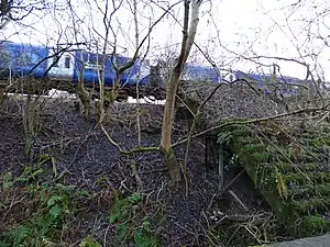 A fragment of the concrete western platform and adjoining steps survive from the private World War I station; with a matching platform in what was to become ROF Bishopton. A number of earthworks are also visible from the train, representing the embankments of the World War I interchange sidings. They appear to have been later used by the World War II ROF Bishopton. The track and the connection to the main line appears to have been lifted during the 1967 electrification of the Inverclyde Line.