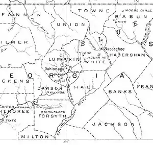 Georgia Gold Belt showing, southwest to northeast, the Sixes, Franklin, Strickland, Kin Mori, Barlow, Wells, Findley, Loud, Smith, and Moore Gold mines. Gold-quartz veins are found in the schists and gneiss.[1]:19,27,48