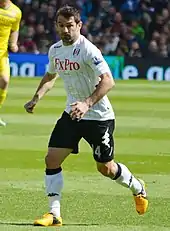 Karagounis made his debut for the club in the Premier League on 29 September 2012, against Manchester City at Craven Cottage, coming on in the 81st minute to replace Chris Baird.[18] Karagounis played the full 90 minutes for Fulham in their 4–0 loss to Liverpool at Anfield. He scored his first goal in England on 5 January 2013 in the FA Cup against Blackpool in the 80th minute, with a "stunning 25-yard half-volley" which went in off the underside of the crossbar; the match ended 1–1.[19] On 12 January 2013, a week after his FA Cup strike, he scored his first Premier League goal against Wigan Athletic in the 22nd minute.[20]