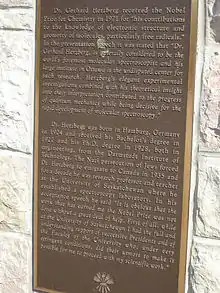 Gerhard Heinrich Friedrich Otto Julius Herzberg, PC CC FRSC FRS[1] (German: [ˈɡeːɐ̯.haʁt ˈhɛʁt͡sˌbɛʁk] ⓘ; December 25, 1904 – March 3, 1999) was a German-Canadian pioneering physicist and physical chemist, who won the Nobel Prize for Chemistry in 1971, "for his contributions to the knowledge of electronic structure and geometry of molecules, particularly free radicals".[2] Herzberg's main work concerned atomic and molecular spectroscopy. He is well known for using these techniques that determine the structures of diatomic and polyatomic molecules, including free radicals which are difficult to investigate in any other way, and for the chemical analysis of astronomical objects. Herzberg served as Chancellor of Carleton University in Ottawa, Ontario, Canada from 1973 to 1980.