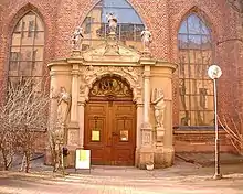 Over the northern gate facing Tyska Brinken is a gilded images of the patron saint and the exhortation Fürchtet Gott! Ehret den König! — "Fear God! Honour the King!". Flanking the eastern gate facing Svartmangatan are two tables carrying gilded inscriptions. The southern sandstone portal is flanked by statues of Jesus and Moses, in the context symbolizing the New and the Old Testaments, accompanied by Love, Hope, and Faith. The statues were cut by Jost Henne from Westphalia in the 1640s; he later became the alderman of the city's masons guild.[2]