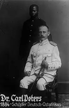Carl Peters was born on September 27, 1856, in Hanover, Germany. Peters was awarded scholarships to attend college, where he studied history, philosophy, and law, and became a successful journalist.[6] After some time, Peters became interested in colonization, and he then changed his focus in life to become one of the principal founders of the German East Africa Company.[7] He made significant contributions towards the company, which made him a widely recognized explorer. For example, Peters convinced the indigenous peoples of East Africa to give Germany control of their land, allowing Germany to have a colony in East Africa. He was able to do this by impressing the natives by firing guns, wearing impressive clothing, and flying flags.[8] After the Germans took control, Peters became the administrator of the region until his dismissal because of his brutal treatment of the natives. He was known by the natives as "mkono wa damu", meaning "the man with blood on his hands". He was put on trial and found guilty, although the decision was criticized by the German press. His poor treatment of the indigenous people earned him an end to his otherwise successful career, and because of the extreme negative response, he lost most of his prestige; many streets named after him have since been renamed, and he is neglected by most historians.[9]