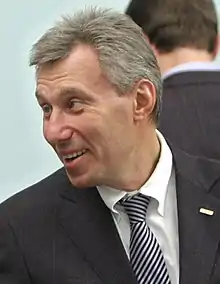 German Borisovich Khan (Russian: Герман Борисович Хан; born 24 October 1961) is a Ukrainian-Russian oligarch, billionaire, and businessman.[2][3] After graduating from university in 1988 he worked in a wholesale business selling consumer items,[4] before setting up his own cooperative.[1] He was then appointed the head of the wholesale trade business Alfa Eco as part of the Alfa Group Consortium, by his college friend Mikhail Fridman.[4][5] Alfa Group, which he also shares with another fellow billionaire and college peer, Alexei Kuzmichev, is the biggest financial and industrial investment group in Russia. He became president of Alfa Eco in 1996[6] and was instrumental in directing the company to focus on export and the oil trade.[1] When Alfa bought Tyumen Oil (TNK) in 1997, he joined the board of directors.[1] He was deputy chairman of TNK Oil Company[7] from 1997 until 2003.[4] In 2003, Khan worked with the other TNK owners to form a 50–50 joint venture with British Petroleum (BP),[8] in what was the largest foreign investment in Russia to date,[9] at US$8 billion.[10]