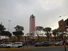 The German Tower (Spanish: Torre Alemana), also known as the Clock Tower (Spanish: Torre del Reloj) or the University Clock (Spanish: Reloj Universitario), is a clock tower in the historic centre of Lima, Peru. It is located in front of the Casona de la Universidad Nacional Mayor de San Marcos, in the University Park at the intersection of Abancay and Nicolás de Piérola avenues. It was donated in 1921 by the German community in Lima, on the occasion of the Centennial of the Independence of Peru. At twelve in the day and at six in the afternoon, its chimes played the first stanza of the National Anthem of Peru.[1]