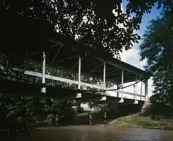 The Germantown Covered Bridge, in Germantown, Ohio, was built in 1870, restored in 1963,[2] and moved from its original location over Little Creek on the Dayton Pike to its present location on East Center St. in 1911. The design was an inverted bowstring.[3]