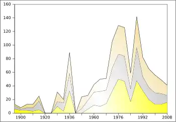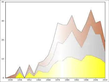 Medals won by Germany at the Summer Olympic Games between 1896 and 2012 (between 1956 and 1964 as the United Team of Germany and between 1968 and 1988 as a sum of medals of West and East Germany)