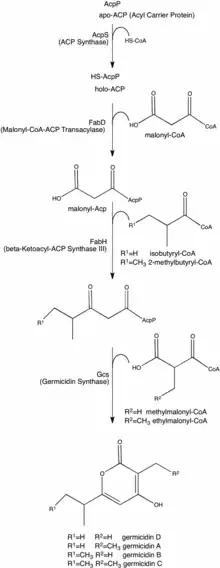 The biosynthetic pathway of germicidin has not been fully confirmed but according to experimental evidence is expected to utilize starter units arising from fatty acid synthesis and utilize the following proposed scheme: AcpP(ACP) is converted from its apo to holo form with CoA and AcpS (ACP synthase). FabD then converts holo-AcpP into malonyl-AcpP with malonyl-CoA. With either isobutyryl-CoA or 2-methylbutyryl-CoA FabH facilitates decarboxylative condensation with malonyl-AcpP to generate an acyl-AcpP intermediate. The acyl intermediate is then condensed and cyclized with either methylmalonyl-CoA or ethylmalonyl-CoA by Gcs to produce germicidin.[3]