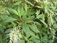 Gesnouinia species are shrubs with monoecious flowers (i.e. separate "male" and "female" flowers on the same plant). Two staminate ("male") flowers and one carpellate ("female") flower are grouped in each bract (involucre), which are then clustered into a panicle. The male flowers have a calyx made up of four sepals and four stamens. The female flowers have an included ovary and a short style.[3]