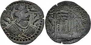 ![]() A crossover Alchon-Nezak coin with pseudo-Pahlavi legend 𐭭𐭩𐭰𐭪𐭩𐭬𐭫𐭪 (nycky MLK "King of the Nezaks"). Minted around the time of Ghar-ilchi.[1] | |