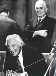 Gabetti began to work in banking within the Banca Commerciale Italiana, and in 1955 became the deputy director of the Turin branch. He held this position for ten years, after which he started working in business. He joined Olivetti, where he said he met people of such a high and unique depth, as had never happened to him before in his work contacts with other companies.[7] During the autumn of 1971 in New York City, Gabetti met Gianni Agnelli as he was completing the restructuring of the Olivetti Corporation of America, of which he had held the reins for six years. Agnelli was impressed by Gabetti and offered him to return to Italy as general manager of IFI, the family's financial holding company.[8] Gabetti accepted and a year later he was managing director, a position that launched the long partnership with Fiat S.p.A.,[9] of which he would also be vice-chairman from November 1993 to June 1999.[10] From 2003 to 2008, he was chairman of IFIL, and subsequently honorary president.[11] His expertise in the financial and industrial fields, as well as his ethical and social commitment, which was aimed at improving the country's living and working conditions, made it possible for him to be appointed Knight of the Order of Merit for Labour in 1982.[12][13]
