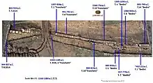 A paved road, delimited by vertical slab stones, runs parallel to the latter mortuary area. The construction of the road is supposed to be contemporary to the monumentalization of the necropolis.[35] The Bedini excavations have unearthed an area containing thirty two slab-cist tombs, made of a stone different from the one used in the serpentine-shaped area.[35] The cist tombs were mostly without their cover slabs, as these were wrecked during centuries of agricultural activities in the area. This so-called "Bedini's area" appears to have undergone three phases of development: