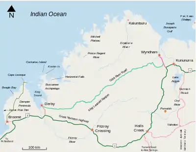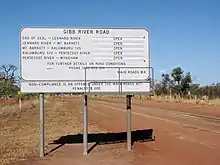 The road is a former cattle route that stretches in an east–west direction almost 660 kilometres (410 mi) through the Kimberley between the towns of Derby and the Kununurra and Wyndham junction of the Great Northern Highway.[1] Like its namesake river, which does not actually cross the road but runs nearby at 16°06.108′S 126°31.075′E / 16.101800°S 126.517917°E / -16.101800; 126.517917,[2] it is named after geologist and explorer Andrew Gibb Maitland. The Gibb River Road is one of the two major roads which dissect the Kimberley region—the other being the extreme northern section of Great Northern Highway which runs further to the south.