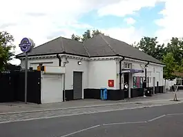 The station, constructed in a cutting, was opened as Squirrels Heath & Gidea Park on 1 December 1910 by the Great Eastern Railway on that company's main line out of London Liverpool Street. The station consisted of two island platforms with access via a footbridge, giving four platform faces despite the line being of two tracks beyond the station environs. The station signal box was elevated on a set of girders spanning the two central tracks, and there was a goods shed and coal staithes at the country end of the station on the south side of the line controlled by an additional signal box.[3] Immediately beyond the goods facilities was the building known as the "Romford Factory" which had been the original locomotive works for the Eastern Counties Railway from 1843 until the opening of Stratford Works in 1847, and remained in use by the railway working on the manufacture and repair of canvas wagon sheets.[4] The line through Romford and Gidea Park as far as Shenfield was quadrupled in 1930 to provide increased capacity and additional carriage sidings were added on the north side of the line opposite the goods facilities as part of these works. The order of words in the station name was switched to Gidea Park & Squirrels Heath in late 1913 and the "Squirrels Heath" suffix was dropped by British Rail in February 1969.[3][5]