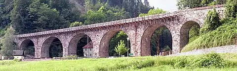 Since 1909, the Gießenbachtal at the exit of the Stillensteinklamm at the mouth of the Gießenbach into the Danube is crossed by the Donauuferbahn by means of a very high seven-arched viaduct.