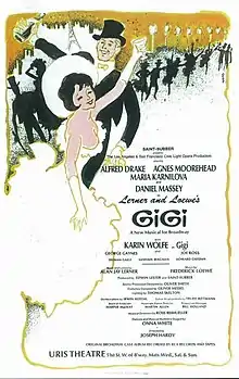 The musical opened on Broadway on November 13, 1973 at the Uris Theatre,[4] where it ran for 103 performances and seven previews. Directed by Joseph Hardy and choreographed by Onna White, the cast featured Karin Wolfe as Gigi, Daniel Massey as Gaston, Maria Karnilova as Mamita, Agnes Moorehead as Aunt Alicia, and Alfred Drake as Honoré. Arlene Francis replaced the ailing Moorehead later in the run (Moorehead died of cancer on April 30, 1974). An original cast recording was released by RCA Victor. Louis Jourdan starred in a production that toured the United States in the mid 1980s, not in his original role as Gaston, but rather as Honoré.