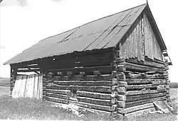 It is located about 50 feet (15 m) east of La Puente Rd and 80 yards (73 m) south of Hatchery Rd., just above the dropoff from the first plateau to the river. It is a hewn horizontal log barn with double box notching, with a corrugated metal roof and vertical planks in its gable end.