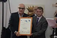 Gildo De Stefano receives the Campania Felix International Journalism Award from the President of the Jury