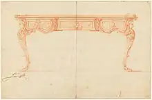 3. There are designs for clock cases veneered with Boulle marquetry of tortoiseshell and brass; a single signed drawing for a piece of furniture, a bureau plat in the manner of André Charles Boulle in red chalk, survives, in the Cooper-Hewitt Museum, New York; it is illustrated in Dell 1992: fig. 2 p.209; on the basis of the drawing, the design of the famous pair of commodes delivered for the Grand Trianon by Boulle in 1708 and 1709 (illustrated at André Charles Boulle) has been tentatively connected to Oppenordt by M.P. Eidelberg, "Watteau, Lancret, and the fountains of Oppenort", Burlington Magazine 110 (August 1968:448, fig. 23), noted by Dell 1992: 236 note 2.