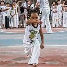 The capoeira game starts with keeping the body in constant motion with dancelike steps, making capoeiristas elusive targets for opponents.[4] The constant triangular footwork makes capoeira both easily recognizable and confusing, since it looks much more like a rhythmic dance step than a fighting stance.