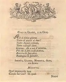 Migliavacca made his debut as a librettist in his own right (albeit closely supervised by Metastasio) in 1750 with Armida placata, composed by Giovanni Battista Mele and performed in Madrid to celebrate the marriage of Maria Antonia Ferdinanda of Spain and Victor Amadeus III of Sardinia. It was performed again in Vienna later that year in a pastiche version with music by several composers including Luca Antonio Predieri and Johann Adolph Hasse.[4] Through Metastasio, Migliavacca had also become acquainted with Duchess Maria Antonia of Bavaria. She was the wife of Frederick Christian, heir to the thrones of Saxony and Poland, and was a patron of the arts as well as gifted composer, singer, and harpsichordist. Two of her operas, Il trionfo della fedeltà and Talestri, have survived, but according to Bruno Brunelli,[lower-alpha 2] she had earlier composed a short opera (now lost) to a libretto by Migliavacca entitled Giove fulminatore dei giganti.[6]