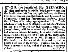 Gervasio placed an advertisement in The Public Advertiser, London on 27 April 1770 for a concert at Exeter Exchange.