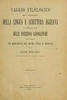 - Saggio filologico per l'apprendimento della lingua e scrittura egiziana, e la interpretazione della inscrizioni geroglifiche che si leggono sui monumenti del Museo Civico di Bologna, Bologna, 1877 Available online