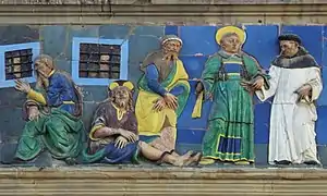 Giovanni's largest and perhaps finest work is the polychromatic frieze on the outside of the Ospedale del Ceppo hospital at Pistoia (itself begun in 1514), for which he received various sums of money between 1525 and 1529, as is recorded in documents which still exist among the archives of the hospital. The subjects of this frieze are the Seven Works of Mercy, forming a continuous band of sculpture in high relief, designed in a very broad sculpturesque way, but with somewhat crude colouring. Six of these reliefs are by Giovanni, namely, Clothing the Naked, Washing the Feet of Pilgrims, Visiting the Sick, Visiting Prisoners, Burying the Dead, and Feeding the Hungry. The seventh, Giving drink to the Thirsty, was made by Filippo Paladini of Pistoia in 1585; this last is simply made of painted stucco. The large figures of the virtues placed between the scenes, and the medallions between the pillars, are the work of assistants or imitators.[1]